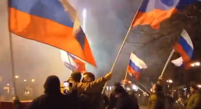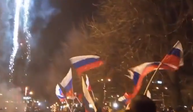 据俄罗斯卫星通讯社及今日俄罗斯22日报道,视频画面显示,顿涅茨克当地民众深夜走上街头,高举俄罗斯国旗庆祝。据悉,当地市中心广场安装了音箱,播放俄罗斯总统的讲话。普京讲话后,聚集在广场上的人们高呼“俄罗斯”,并相互祝贺。