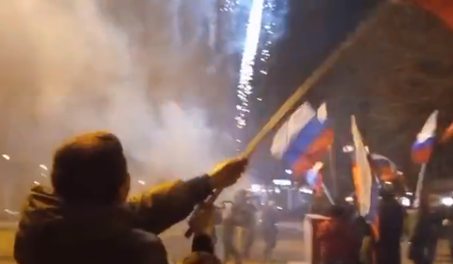 当地时间21日,俄罗斯总统普京签署命令,承认乌克兰东部的“顿涅茨克人民共和国”和“卢甘斯克人民共和国”。得知这一消息后,顿涅茨克地区的民众走上街头,高呼“俄罗斯”,并燃放烟花。