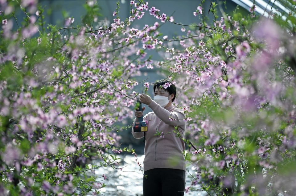 2月15日,宁夏青铜峡市大坝镇韦桥村村民李文会在日光温室为桃树疏果、剪枝。新华社记者 王鹏 摄