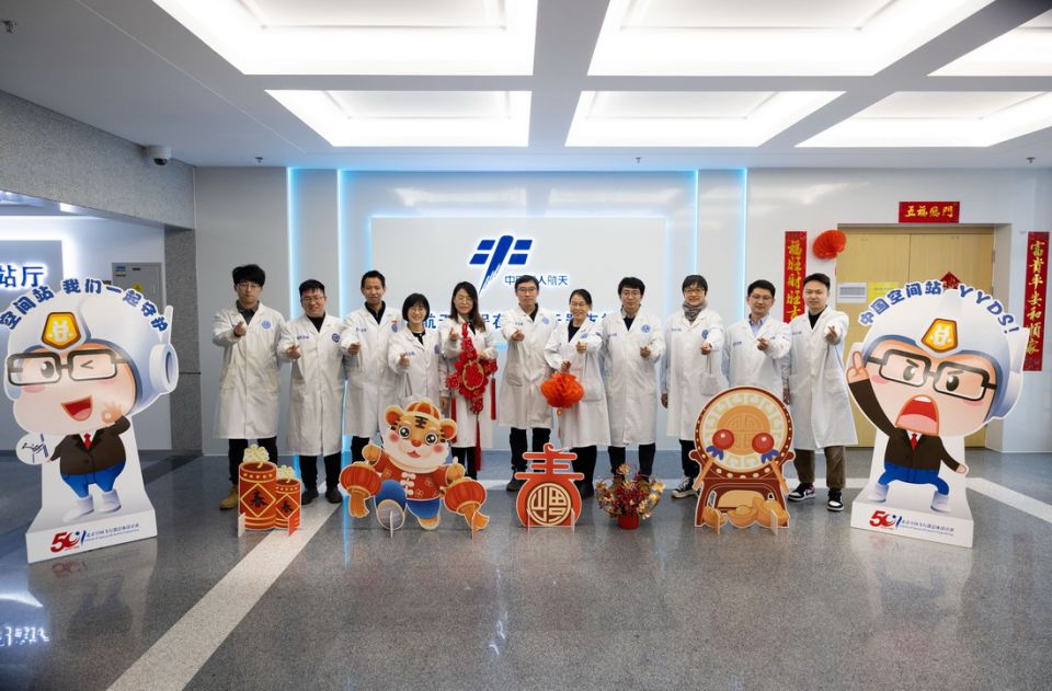 1月30日,在航天科技集团五院在轨航天器支持中心数字空间站外,空间站任务飞控试验队科研人员合影留念。新华社记者 金立旺 摄