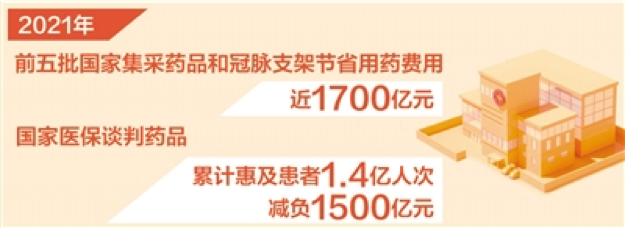 2021年,42个胰岛素专项集采品种平均降价48%,人工髋关节、膝关节集采产品平均降价82%,预计惠及近1100万患者,每年减负近300亿元;2021版药品目录品种增至2860种,67种谈判药品平均降价62%。这些政策今年将全部落地,让更多群众用上质优价廉的医药产品。(孙秀艳)