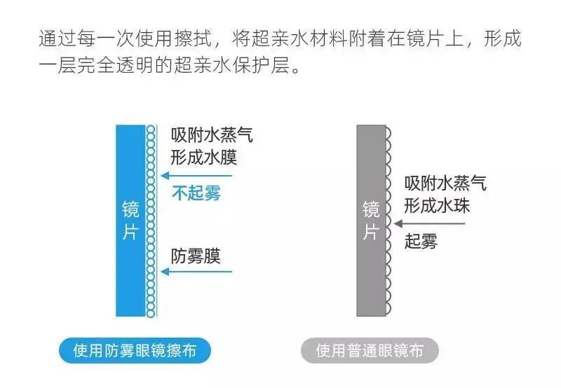 眼镜起雾是因为水蒸气凝结成水滴,如果将水滴扩散成不妨碍视觉的均匀薄膜,便能够起到防雾的效果。涂层的防雾性能,正是通过这种扩散速度来衡量的。