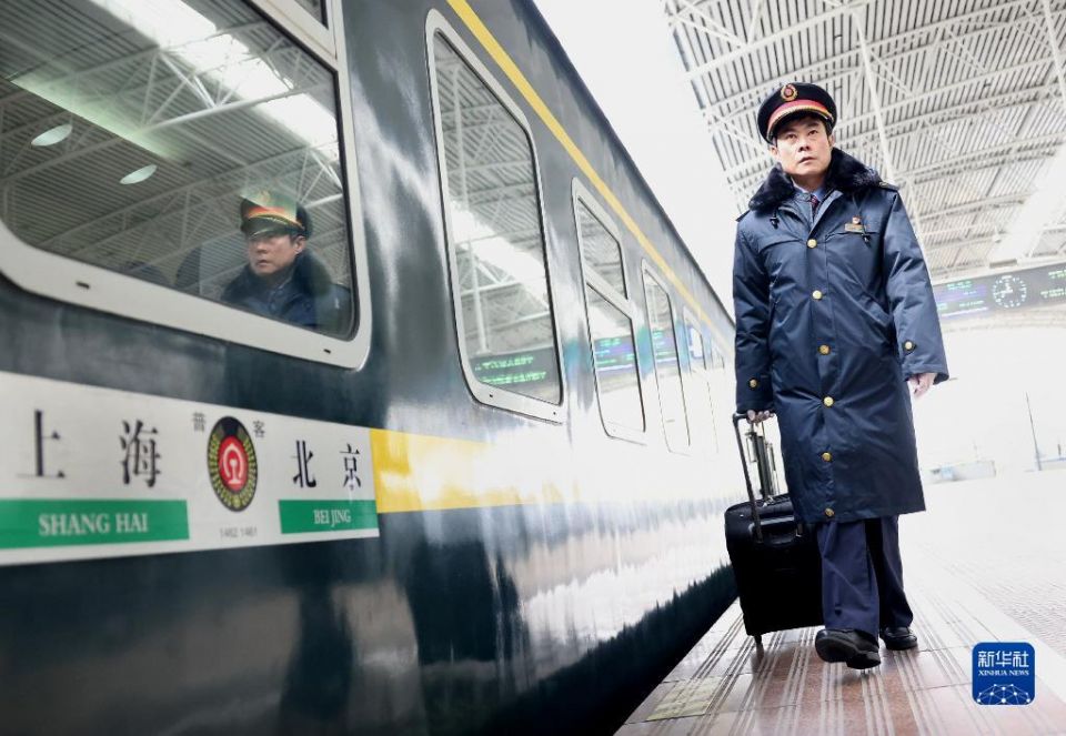2月24日,担当1462次列车值乘任务的谢伟平在上海火车站准备出乘。