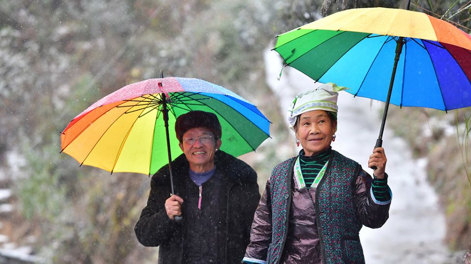 在乌英苗寨,村民梁安合和妻子梁英迷在赏雪(2021年12月26日摄)。乌英苗寨位于桂黔交界的大苗山深处,曾经是一个极度贫困的苗寨。2020年,乌英苗寨实现整体脱贫。新华社记者 黄孝邦 摄