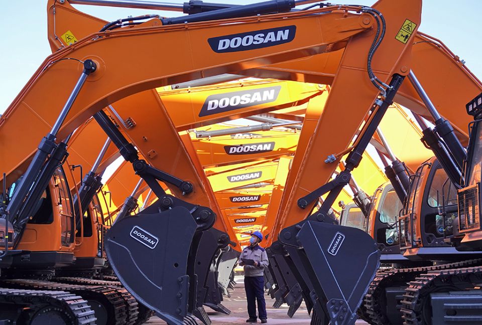 1月17日,在山东烟台开发区一家工程机械有限公司,工作人员对出厂机械设备进行检查。新华社发(唐克 摄)