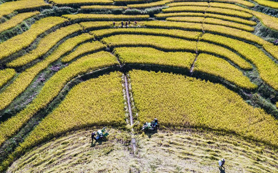 2021年9月21日,湖北省秭归县沙镇溪镇村民在田间收获高山冷水稻(无人机照片)。新华社发(向红梅 摄)
