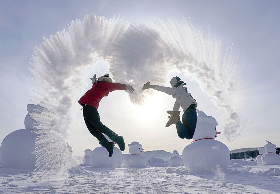 2019年1月24日,在黑龙江省漠河市北极村,游客体验“泼水成冰”游戏。新华社记者 才扬 摄