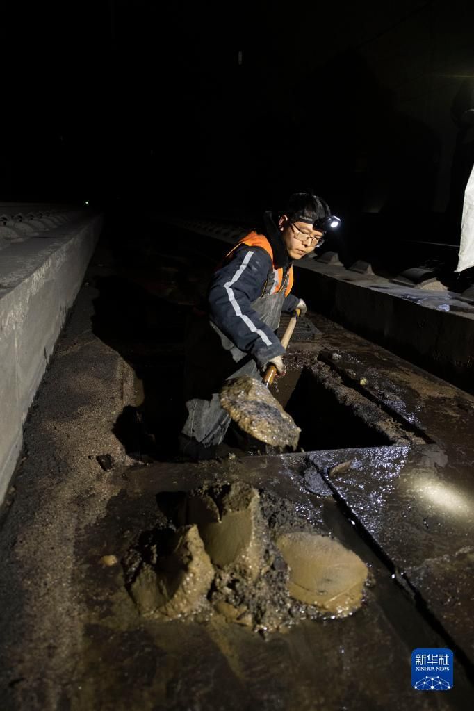 太原南工务段绥德桥隧车间的桥隧工在太中铁路吴堡隧道内清淤。新华社记者 杨晨光 摄
