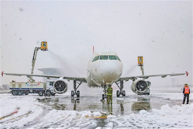 江苏南京禄口国际机场机务人员为飞机除冰。
