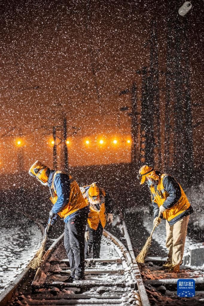 中国铁路郑州局集团有限公司新乡桥工段,铁路工人们冒雪清扫铁路道岔积雪。 新华社发(高国桥 摄)