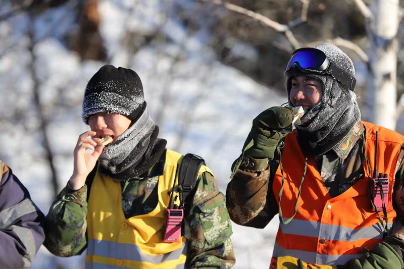中国铁路哈尔滨局集团有限公司加格达奇工务段青年线路工坚守在大兴安岭深处,在寒风中解决午餐。