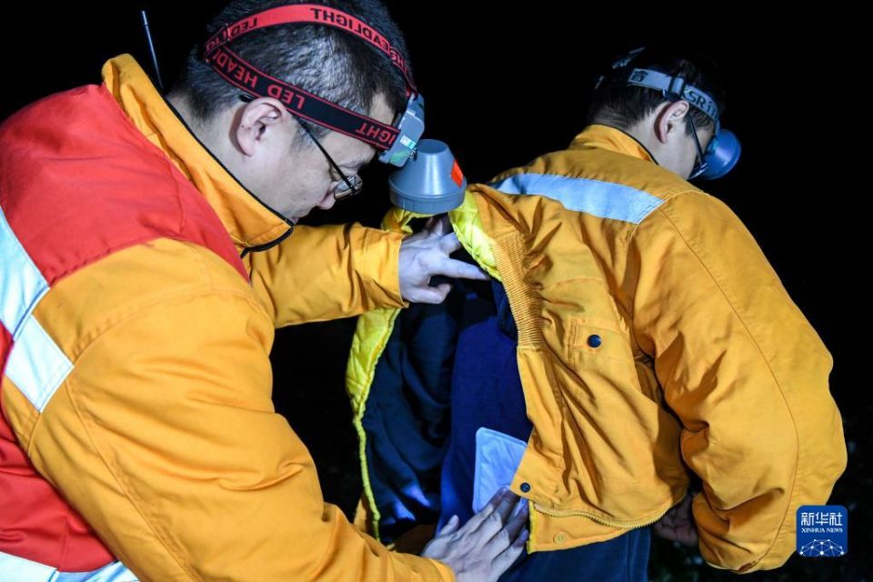 为了抵御夜间寒冷,广西沿海铁路公司钦州工务段工作人员互相帮对方贴上“暖宝宝”。新华社记者 曹祎铭 摄