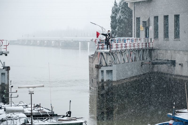 江苏省苏北航务处船闸工作人员在雪中指挥船舶过闸。
