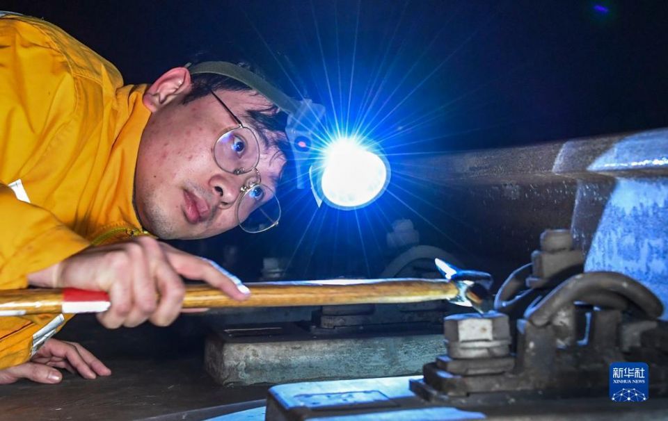 广西沿海铁路公司钦州工务段工作人员利用检查锤探查轨道扣件状态。新华社记者 曹祎铭 摄