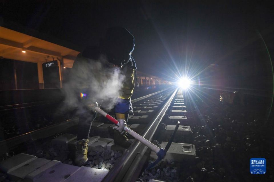 长春农安火车站,线路工清理铁轨下的道砟。新华社记者 张楠 摄