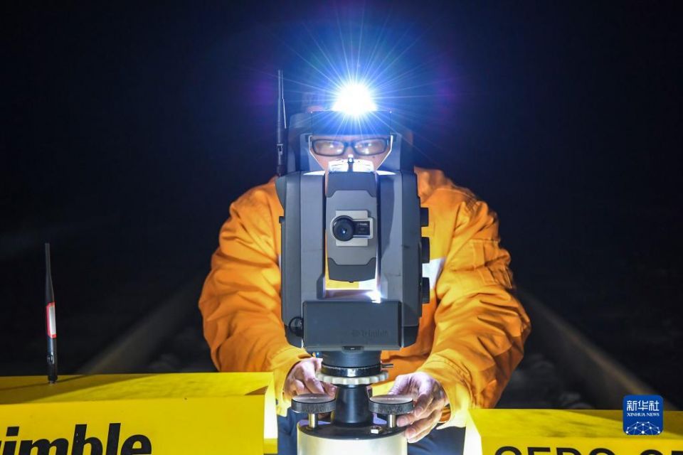 广西沿海铁路公司钦州工务段工作人员在校准全站仪。新华社记者 曹祎铭 摄