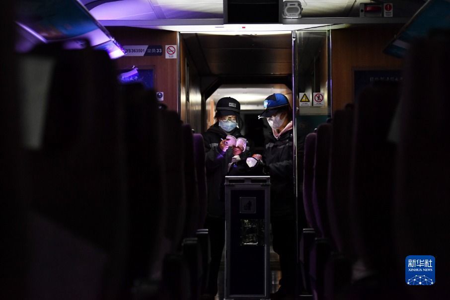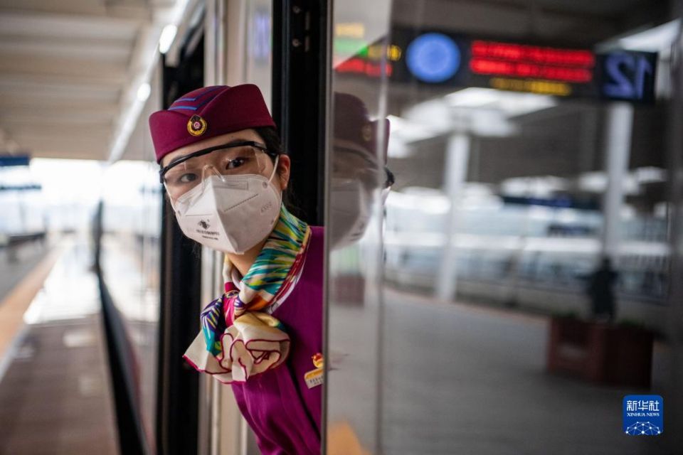重庆北站,乘务员在智能复兴号“共青团号”列车发车前做准备工作。新华社记者 唐奕 摄