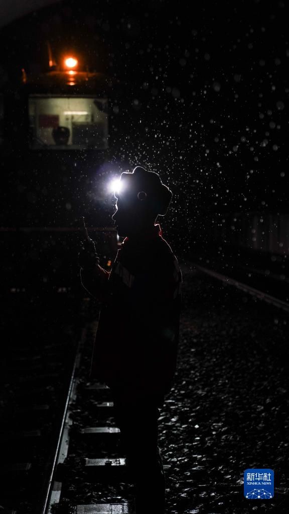 中国铁路南昌局集团有限公司鹰潭工务机械段工作人员在夜间指挥机车作业。新华社记者 胡晨欢 摄