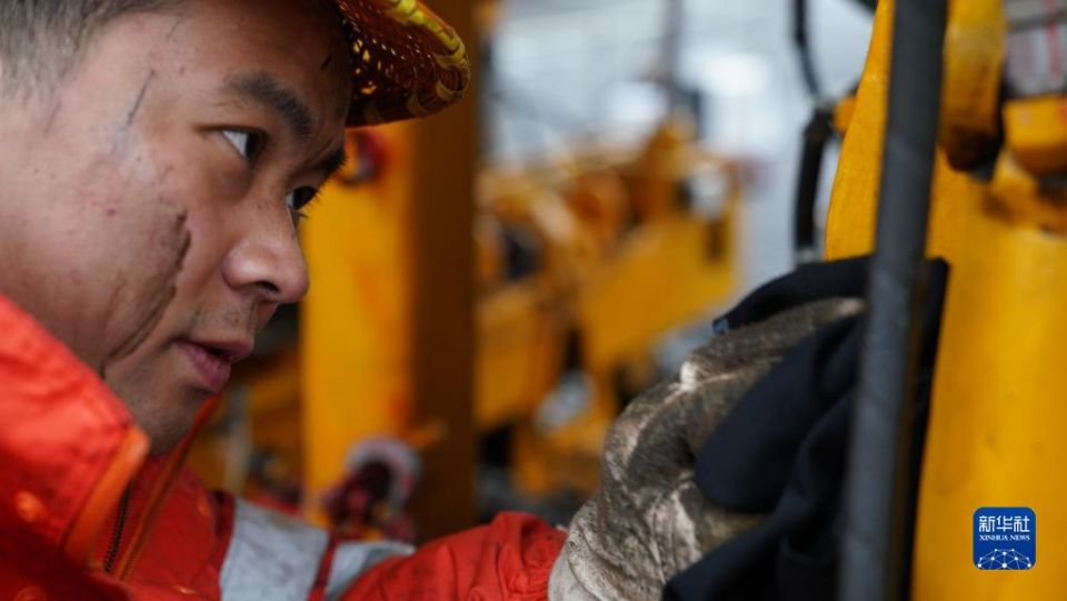 中国铁路南昌局集团有限公司鹰潭工务机械段工作人员对机械设备进行养护。新华社记者 胡晨欢 摄