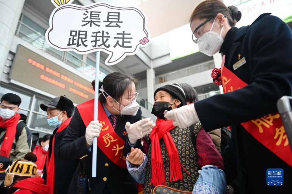 福州火车站工作人员给返乡老人讲解乘车注意事项。新华社记者 林善传 摄