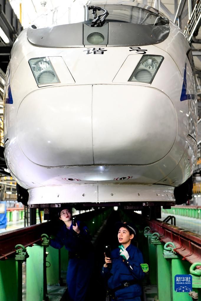 国铁济南局青岛动车段济南动车所,“动车女医生”对动车组车底转向架进行检查。新华社记者 郭绪雷 摄