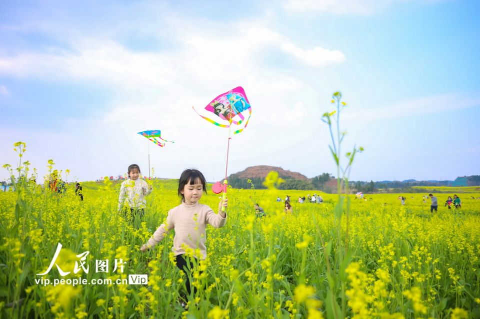 2022年2月26日,四川省遂宁高新区七彩花海景区的油菜花竞相绽放,金黄色的花海吸引了当地市民和周边游客前来踏青观花,打卡拍照,享受春日闲暇时光。刘昌松摄(人民图片网)