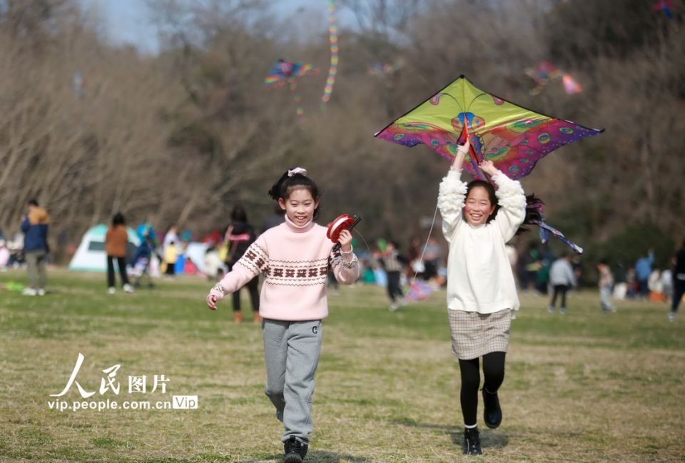 2022年2月26日,风和日丽,许多家长带着孩子来到江苏省扬州市风筝广场踏青赏景、放飞风筝,乐享春光。孟德龙摄(人民图片网)