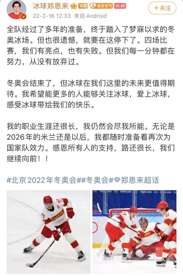 郑恩来在社交媒体写道:全队经过了多年的准备,终于踏入了梦寐以求的冬奥冰场。但也很遗憾,就要在这停下了。四场比赛,我们有亮点,也有失败。但我们每一分钟都在努力,从没有放弃过。冬奥会结束了,但冰球在我们这里的未来更值得期待。我希望能更多的人能够关注冰球,爱上冰球,感受冰球带给我们的快乐。我的职业生涯还很长,我仍然会尽我所能。无论是2026年的米兰还是以后,我都随时准备着再次为国家队效力。感恩所有人的支持,路还很长,我们继续向前!!