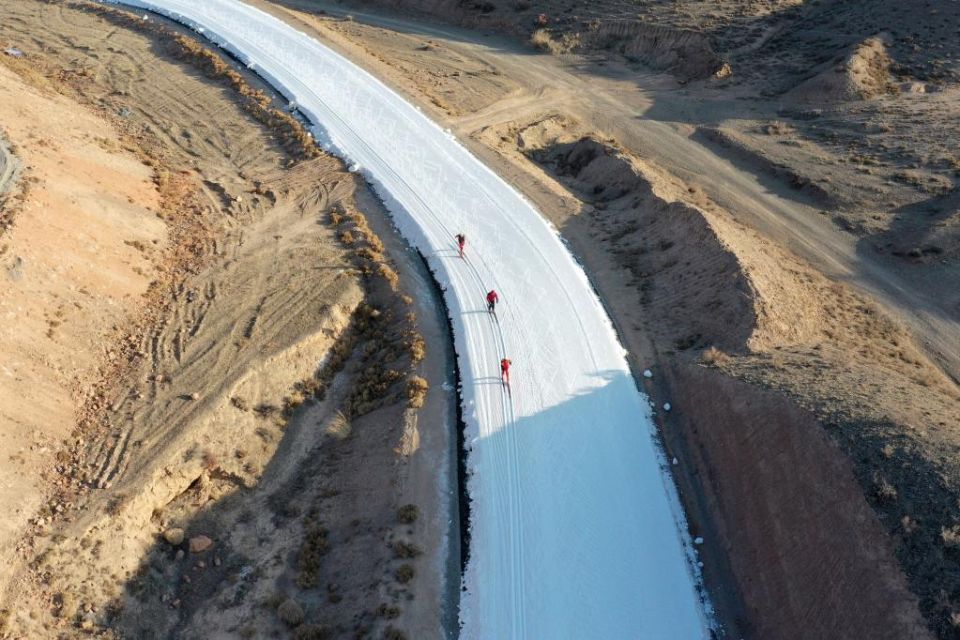 1月13日,集训队队员在甘肃白银国家雪上项目训练基地训练中。新华社记者杜哲宇摄