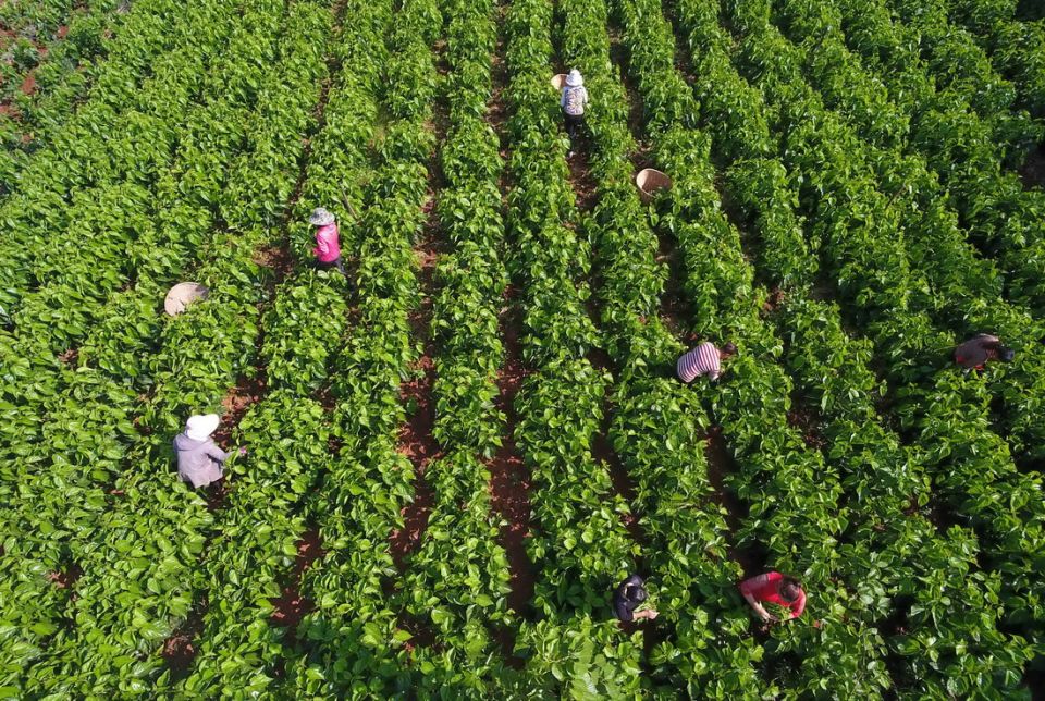 云南寻甸县金所街道草海子村的农妇在采摘蚕桑叶(2020年5月16日摄,无人机照片)。当地大力发展蚕桑等特色种养殖和加工产业,带动农民脱贫增收致富。新华社记者 杨宗友 摄