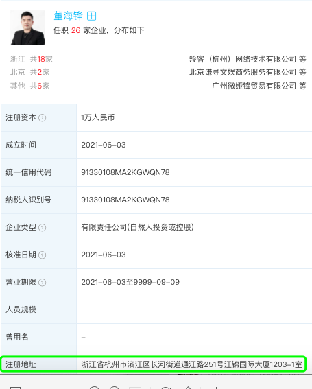 但红星资本局发现,薇娅老公董海峰旗下的杭州兰海企业管理咨询公司、杭州丰瀚企业管理有限公司的注册地址,与柏峰文化的注册地址同在杭州市滨江区江锦国际大厦内,只隔了5层楼。