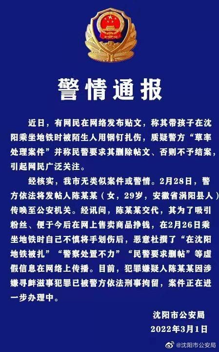 经核实,我市无类似案件或警情。2月28日,警方依法将发帖人陈某某(女,29岁,安徽省涡阳县人)传唤至公安机关。经讯问,陈某某交代,其为了吸引粉丝、便于今后在网上售卖商品挣钱,在2月26日乘坐地铁时自己不慎将手划伤后,恶意杜撰了“在沈阳地铁被扎”“警察处置不力”“民警要求删帖”等虚假信息在网络上传播。目前,犯罪嫌疑人陈某某因涉嫌寻衅滋事犯罪已被警方依法刑事拘留,案件正在进一步办理中。