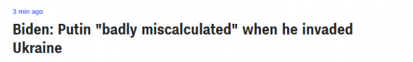 据美国有线电视新闻网(CNN)最新消息,拜登在演讲中声称,俄总统普京在俄乌战事上“严重失算”。