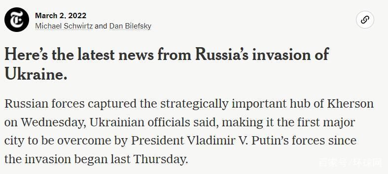 【环球网报道】据美国《纽约时报》最新消息,乌克兰赫尔松市长伊戈尔·科雷哈耶夫及乌克兰官员表示,俄军周三(3月2日)占领了乌南部重要战略城市赫尔松,该市由此成为自上周四(2月24日)俄罗斯“入侵”乌克兰以来,俄军攻占的乌克兰首个主要城市。