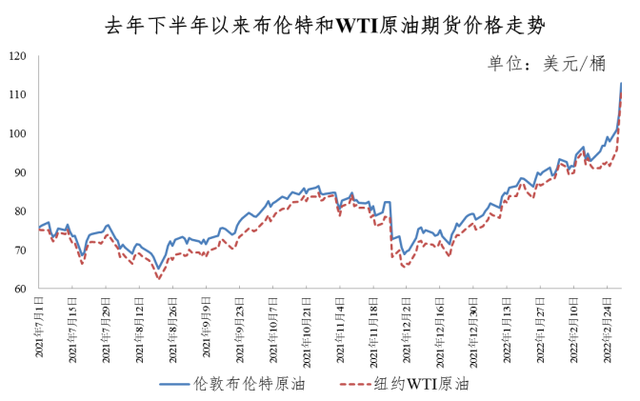 调价周期内,俄乌局势激化,推动油价持续大幅上涨。俄罗斯承认乌东地区独立,并采取特别军事行动,欧美随即宣布制裁措施,市场对原油供应下降的忧虑加重。欧佩克坚持“有限”扩产,美国原油库存下降,国际能源署计划释放的6000万桶原油储备规模不及全球一天消费量,更放大了市场对供应短缺的紧张情绪,油价因此持续冲高,3个交易日内两市油价连续跳涨并先后突破每桶100美元、110美元关口。平均来看,本轮调价周期伦敦布伦特、纽约WTI油价分别比上一调价周期上涨7.44%、4.78%。