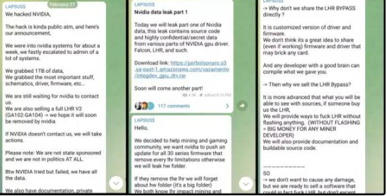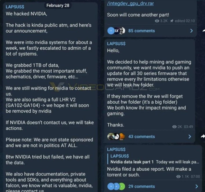 2月28日,Lapsus$声称,为了造福“挖矿与游戏社群”,并威胁英伟达公布所有产品上限制显卡挖矿性能的“精简哈希值”(LHR,Lite Hash Rate)锁定软件与固件数据。若英伟达就范,他们可以当这些文件没存在过。