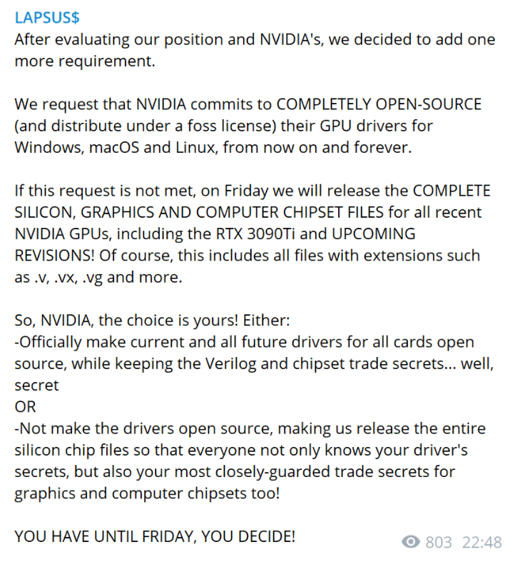 3月1日,Lapsus$称“考虑到我方和英伟达方面的各自立场”,要求英伟达将所有已发布和未来显卡的Windows、MacOS、Linux各版本驱动在FOSS项目协议下永久全部开源。如若在本周五前还没做到,Lapsus$就将公开所有英伟达已发布和将要发布的显卡的产品规范、图纸、基础介质信息。
