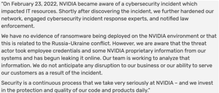 “在发现被黑后不久,本公司就加强了网络防范、咨询了网络安全事件应对专家,并通知了执法部门。现在没有证据表明英伟达内网中还有勒索软件,或者此事与当下的俄乌冲突有关。