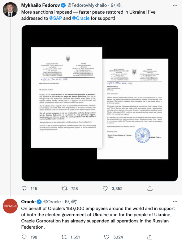 ▲Oracle公司断供俄罗斯,乌克兰副总理感谢其支持