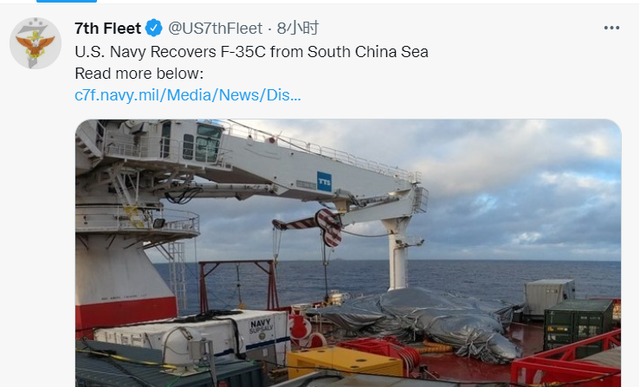 据美国有线电视新闻网3日报道,美国海军第七舰队当天发布新闻稿称,美国海军2日从南海回收了1月撞上航母甲板,随后坠海的美军F-35C战斗机的残骸。“这架飞机将被交付到附近的一个军事设施,以协助调查,并评估被运送到美国的可能性”,新闻稿中这样表示。