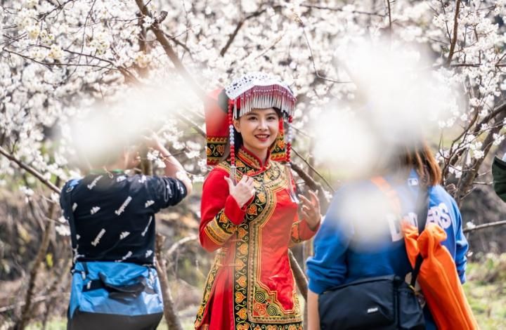 人民网毕节3月4日电 (涂敏)3月3日,毕节市九洞天景区内的连片樱桃花竞相盛开,盛开的“樱桃花海”吸引了大量游客前来赏花游玩。