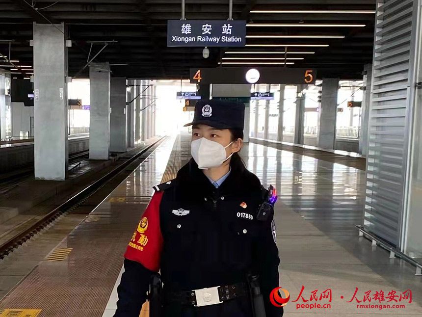 图为孙明明在雄安站巡逻。石家庄铁路公安处雄安站派出所供图。