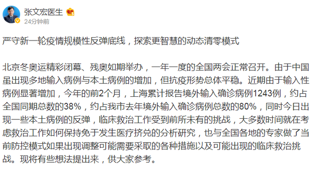就在刚刚,张文宏更新个人微博称,严守新一轮疫情规模性反弹底线,探索更智慧的动态清零模式——