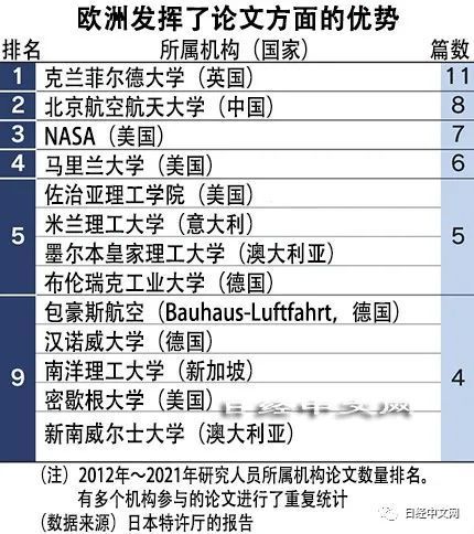 在研究开发方面,欧洲拥有雄厚的实力。2012年到2021年,以英语发表的飞行汽车相关论文共404篇,其中欧洲研究机构和企业的在职研究人员发表的论文达到152篇,占比近4成。在所属机构排名中,英国克兰菲尔德大学名列榜首,此外意大利米兰理工大学等的排名也十分靠前。