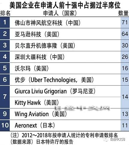 按申请人统计的专利申请数排名来看,美国企业实力雄厚,在前15家企业中占据11家。多种行业的企业榜上有名,包括亚马逊科技(Amazon Technologies)和谷歌的集团企业Wing Aviation等大型IT企业、贝尔直升机德事隆(Bell Helicopter Textron)及波音等飞机制造商、沃尔玛等零售企业。中国企业同样表现抢眼,飞行汽车初创企业“佛山市神风航空科技”名列第一,此外,无人机大企业大疆的关联企业排名第四。