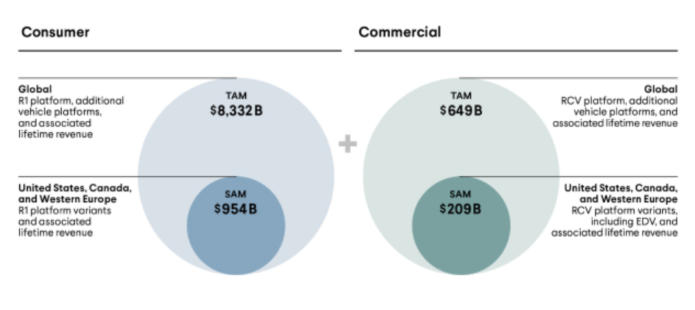 招股书中,Rivian用赛道总空间 (“TAM”) 和自己可触达的空间 (“SAM”) 来定义Rivian市场机会。Rivian还根据消费者和商用车辆的新车销售市场计算Rivian的 SAM 和 TAM。