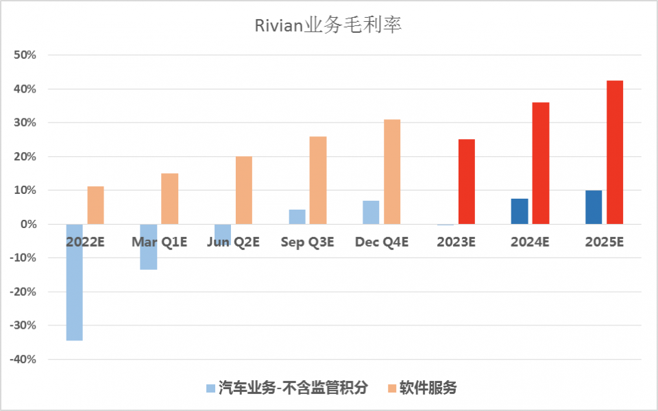 Rivian汽车业务(不含监管积分),到2023年第三季度转正(全年-0.3%),2025年10%,软件业务毛利率超过40%。
