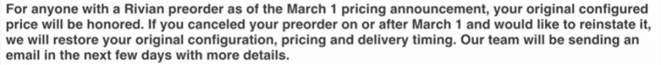 2022年3月,Rivian有意单车提价12000-20000美元,遭遇预订者激烈抵制,有报道称,用户大规模退订,Rivian的CEO斯卡林格随后宣布放弃对预订者提价: