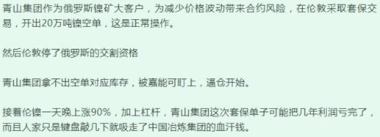 市场传闻称,青山控股如果拿不出那么多现货,潜在空头头寸损失可能高达60亿美元至120亿美元,而恶意逼空的外资,则趁机以其在印尼的某镍矿60%股份为代价提出要挟。