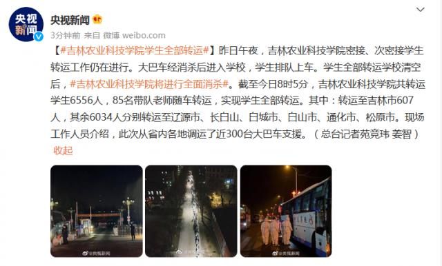 首页 昨夜吉林农业科技学院6556名学生已全部转运 2022-03-11 10:36:35 分享 昨日午夜,吉林农业科技学院密接、次密接学生转运工作仍在进行。大巴车经消杀后进入学校,学生排队上车。学生全部转运学校清空后,吉林农业科技学院将进行全面消杀。截至今日8时5分,吉林农业科技学院共转运学生6556人,85名带队老师随车转运,实现学生全部转运。其中:转运至吉林市607人,其余6034人分别转运至辽源市、长白山、白城市、白山市、通化市、松原市。现场工作人员介绍,此次从省内各地调运了近300台大巴车支援。(来源:央视新闻)